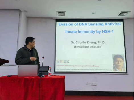 师生介绍了其研究团队近些年在单纯疱疹病毒HSV-1如何进行免疫逃逸方面的研究工作,郑教授汇报的题目为“Evasion of DNA Sensing Antiviral Innate Immunity by HSV-1”。本次报告由邱烨副教授主持,91成人网