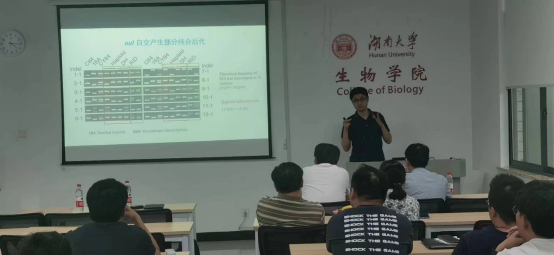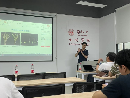 2019年,王克剑团队首次建立了杂交水稻无融合生殖体系,获得了杂交水稻的克隆种子,证实杂交水稻自繁种的可行性。2023年,王克剑团队在杂交稻的无融合生殖研究中再次取得新进展:用能够诱导卵细胞特异性表达的拟南芥启动子pDD45,在杂交稻春优84(CY84)中,通过农杆菌介导的遗传转化,分别转入了水稻中其他三个类似于BBM1(BBM家族是在有性生殖狼尾草中发现的一种能够诱导孤雌生殖的基因)但表达模式各不相同的基因,并最终得到卵细胞异位表达能够触发杂交水稻的孤雌生殖并诱导单倍体BBM4。将其与MiMe结合构建植株,观察统计植株、穗、籽粒形态以及结实率,再通过全基因组测序,最终得到了结实率几乎不受影响的无融合生殖杂交水稻植株——解决了无融合生殖体系中存在的植株结实率低的问题。整场报告精彩生动,学术氛围浓厚,老师与学生们的反响热烈,大家都表示受益匪浅。