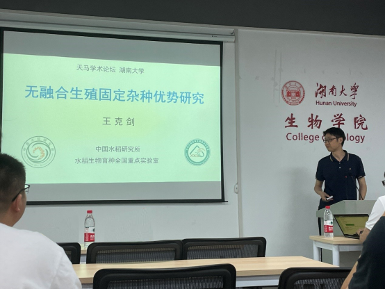 杂种优势是指将两个不同纯系进行杂交,得到的杂交后代在某些性状(如产量、生长速度、抗逆性)上优于两个亲本。然而,当杂交后代继续繁衍下去时,有性生殖过程中的基因重组会导致性状分离使得优良性状丢失。为此,每年都需要培育新的杂交种子。在自然界中确有一种被称为无融合生殖的无性繁殖方式,可以使植物在不受精的情况下产生与母体基因型相同的克隆种子。但是这种现象并不存在于主要作物中,因此,培育无融合生殖作物长期被誉为农业研究领域的“圣杯”。此次,王克剑研究员做了无融合生殖固定杂种优势研究的讲座,从水稻第一次绿色革命开始讲解,全面讲述了水稻无融合生殖的发展,同时还讲解了无融合生殖设计路线以及如何利用基因编辑技术在水稻无融合生殖研究领域取得重大成果。