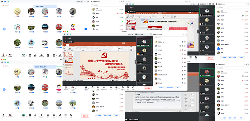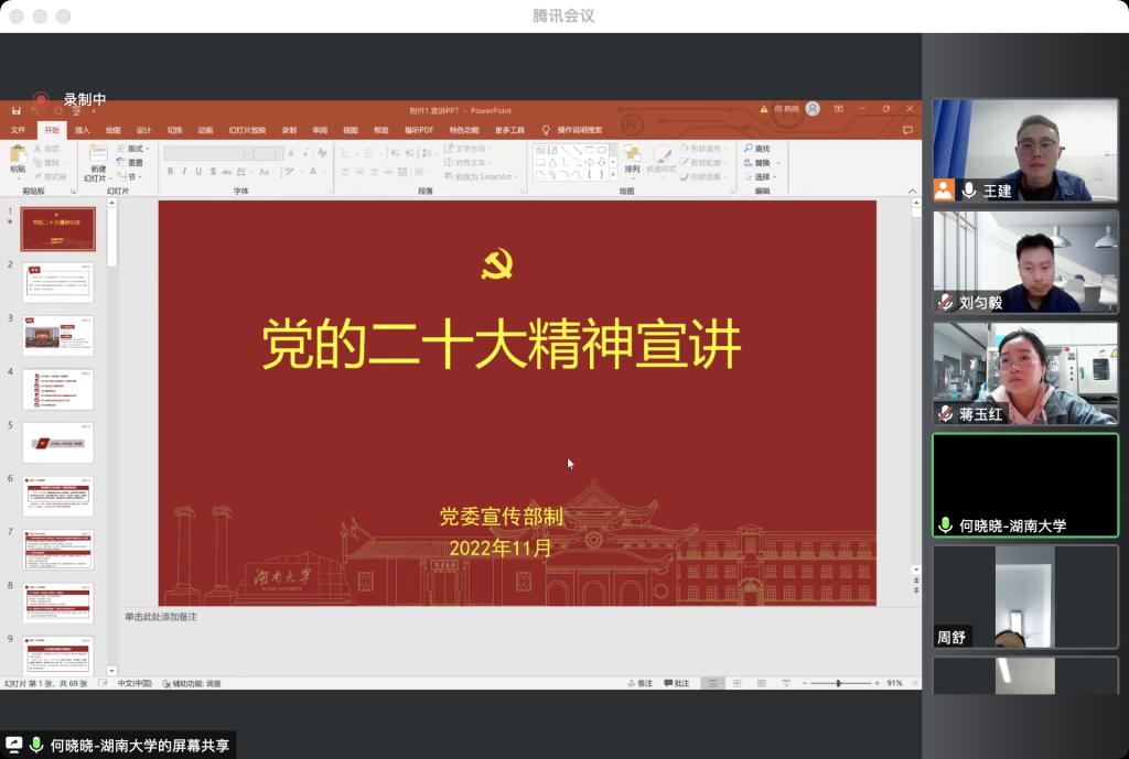 在会议的第二阶段,部分党员代表结合何老师分享内容以及自己的科研成果,畅谈了研究生在全面建设社会主义现代化国家新征程中的使命担当。谢甜甜同志表示:“作为研究生党员要把学习贯彻党的二十大精神作为第一堂党课,努力提高自己的政治素养和思想理论水平,在党赋予的光荣岗位上以‘学懂’、‘弄懂’、‘做实’的态度做出不平凡的新成绩。”卜会铜同志表示:“作为一名生物学博士,疫情当下进一步体现我们的价值,既是机遇也是挑战,要以实际行动践行党的二十大精神,在第二个百年奋斗目标的新征程上展现青春动能。” 刘匀毅同志就“加强基础研究”发表了自己的见解,“作为新时代的接班人,需要肩负起历史使命,抱有远大理想、努力提高自身素养、调整心态、摆好位置、树立终身学习的观念,奋力谱写全面建设社会主义现代化国家的崭新篇章。”刘翠翠、张运生、简珂等同志一一发言,从不同角度对如何落实二十大精神在自己的科研工作中发表了见解。大家的分享充分展现了当代湖大人的责任与担当,在全支部树立了模范就在身边的意识观念,向优秀学习,向先进看齐,进一步促进了党建特色与学术科研优势的深度融合。