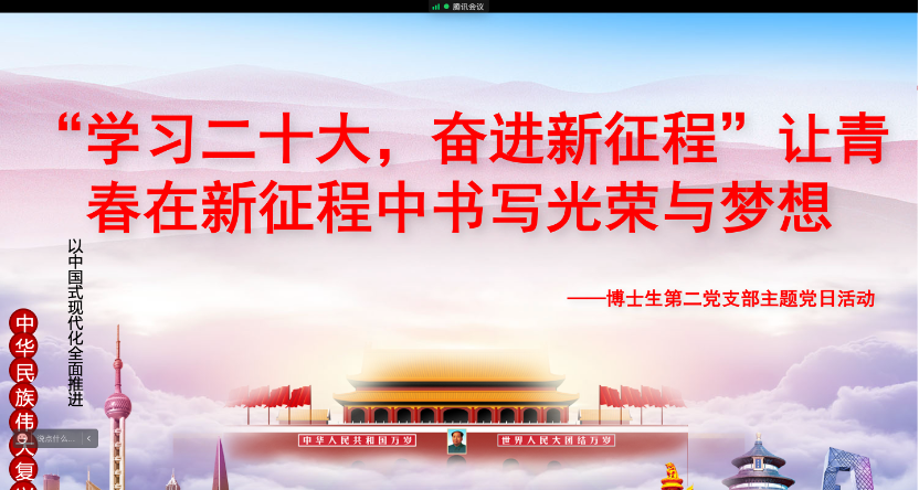 博士生第二党支部特别邀请学院党委委员,副院长,何晓晓教授组织开展“学习二十大,奋进新征程”让青春在新征程中书写光荣与梦想主题党日活动,帮助大家将学习贯彻党的二十大精神文件要求自觉转变为思想指引,畅谈研究生在全面建设社会主义现代化国家新征程中的使命担当。博士生第二党支部全体党员、发展对象以及入党积极分子参会,党支部书记王建主持会议。