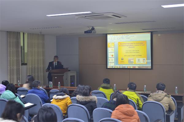 进行学术交流,为学院师生作了题为“Beneficial microbes for Australian broadacre agriculture: control of root diseases”的学术报告。Chris教授系统地介绍了其关于内生放线菌的研究成果与最新发现,其中详细介绍了一株分离自小麦体内的内生放线菌在防治小麦根部疾病的作用机理,明确了其在病害防治和诱导植物产生系统抗性中所扮演的关键角色。