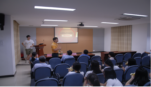 最后,在曾健智同学的主持下,开始了师生交流环节。通过击鼓传花的方式,老师和同学都有分享心中的感受和大学四年最美好的回忆。老师们向学生们说了心中最难忘的大学回忆以及人生感慨,每一段故事都激发在座的同学不同的情感,对同学们接下来的学习和生活十分具有指导意义。座谈的最后,所有的中心思想汇成一个词:珍惜,要珍惜身边的这群伙伴以及剩下相伴的这些天,“珍惜彼此、珍惜现在、珍惜将来”。
