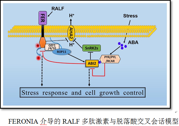 受体激酶FERONIA及其家族成员为一类植物界保守的多功能明星分子,其在植物生长发育及虫害、干旱及盐碱等逆境响应中都发挥重要作用。FERONIA在根中响应其配体分子RALF多肽信号从而抑制主根细胞生长。于峰副教授课题组在前期工作中发现FERONIA通过小G蛋白信号途径激活磷酸酶ABI2从而抑制脱落酸信号(PNAS, 2012, 109: 14693-14698)。最近,课题组陈佳博士生发现被FERONIA激活的磷酸酶ABI2能与FERONIA激酶互作并使其去磷酸化,从而形成一种负反馈调节模式,由此该工作提出了脱落酸与RALF信号交叉会话的模型:在正常生长条件下,RALF信号通过其受体FERONIA抑制脱落酸信号及其逆境应答反应;在逆境(如盐、温度、病虫害等)条件下,植物脱落酸含量升高并抑制ABI2磷酸酶活性从而上调RALF信号响应,实现逆境下植物生长速率的减缓,最终增强其生存能力。