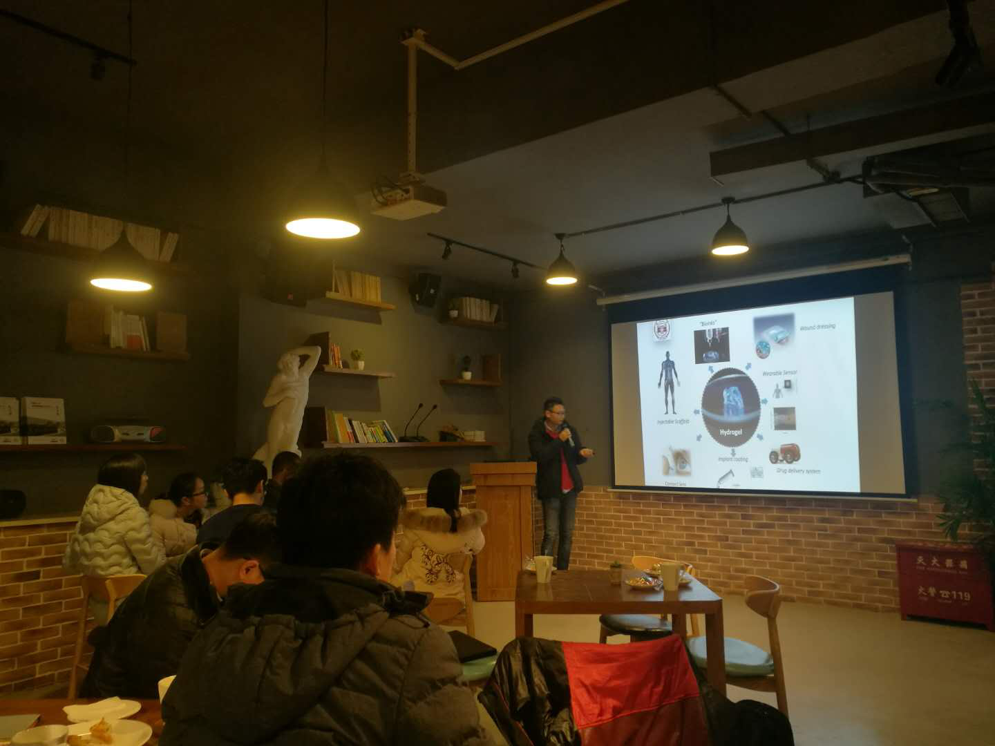 和纳米医学中心的最新研究成果;生医党支部党员施李扬副教授做了题为“水凝胶材料的合成与应用“的学术报告,他主要介绍了他在瑞典攻读博士学位阶段的主要工作,展示了新型水凝胶材料的独特性能和潜在应用,得到了现在材料领域专家的赞赏和认可。化学化工学院的邢航和周一歌两位教授也就他们的研究方向做了精彩的学术报告。