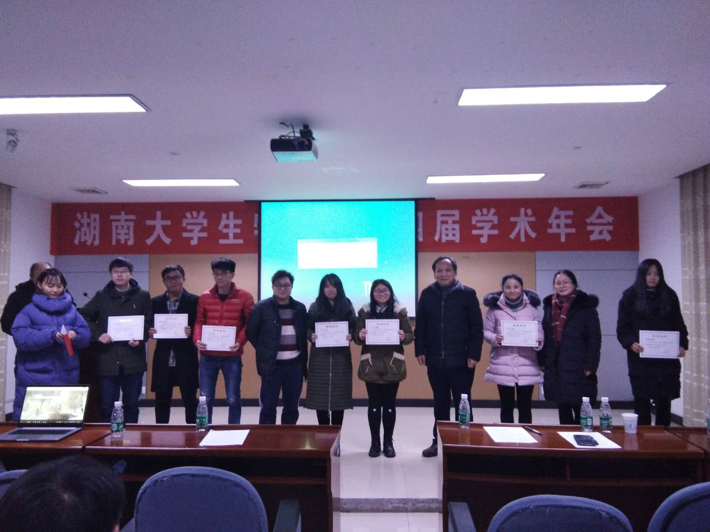 津湘创新奖学金实施办法》文件精神,结合教授委员会的评分,对第一届“津湘创新奖学金”申报人选进行了评选,博士研究生雷正丽、硕士研究生赵传、本科生方若名获得了第一届“津湘创新奖学金”。中午1:00,学院学术墙报评审委员会在参观学术墙报展后对参评的14个学术墙报进行了评审,最终张振旺、盛旭楠等同学获得了优秀学术墙报。下午学术报告结束后,院领导为获奖同学颁发了奖金和荣誉证书。