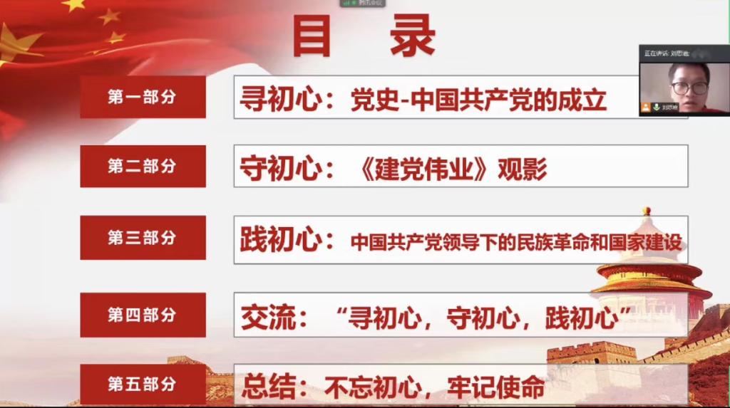 随后,活动进行第二项,《建党伟业》影片的观看,影片主要描绘了从1911年辛亥革命后到1921年中共一大召开为止的十年间中国发生的一系列重大历史事件,以及陈独秀、李大钊、毛泽东、周恩来等马克思主义者为探索真正属于中国的新民主主义革命道路而赴汤蹈火的故事。影片放映完毕,刘思迪继续带领大家学习中国共产党领导下的民族革命和国家建设的党史,他提出,中国共产党带领国家和人民站起来、富起来、强起来的光辉历程,也正是我们伟大的党践行初心的历程。