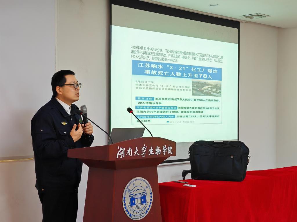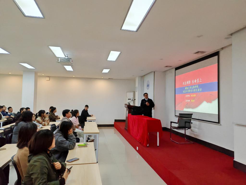 开展“关注消防,生命至上”消防安全普及培训活动,湖南省普安消防公司张教官主讲,学院党委书记陈艳、副书记邹志成、实验室教师以及本研学生寝室长参加培训。