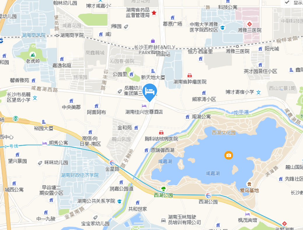 地址:湖南省长沙市岳麓区金星中路247号(酒店位于金星中路与咸嘉湖西路交汇处)