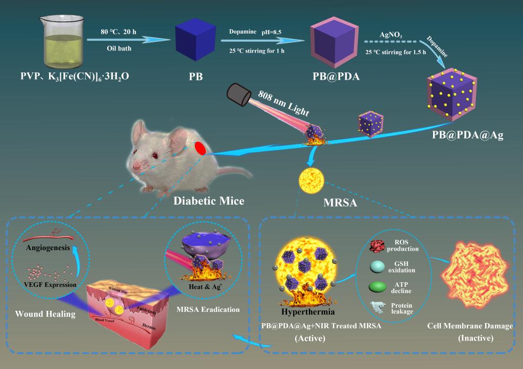刘斌副教授课题组针对纳米银材料的团聚和抗菌效能问题,创造性的将银纳米粒子镶嵌在具有良好光热性能的普鲁士蓝纳米复合物表面,构建了一种双模式纳米抗菌复合物,结合近红外光激光照射技术,有效地促进了糖尿病小鼠多药耐药菌感染伤口的快速愈合。体外研究显示:这种联合抗菌策略通过破坏细胞完整性、产生ROS、降低ATP、氧化GSH等途径发挥抗多药耐药菌MRSA作用;体内实验表明:该策略通过减轻局部炎症反应和诱导创面血管内皮生长因子表达来促进MRSA感染的糖尿病创面愈合。研究结果以论文形式发表在生物材料Top期刊Biomaterials(10.1016/j.biomaterials.2020.119936),并已同步申请专利(CN201911347212.6),为后续产品研发奠定了坚实的基础。论文第一单位为91成人网