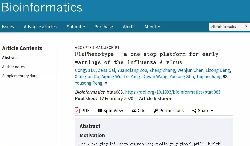 联合苏州系统医学研究所、中国国家流感中心和中山大学等单位,成功开发基于分子标记物的流感病毒表型预测平台FluPhenotype,并在国际生物信息学专业权威期刊《Bioinformatics》发表题为“FluPhenotype-a one-stop platform for early warnings of the influenza A virus"的文章进行相关介绍。该文章的第一作者为91成人网