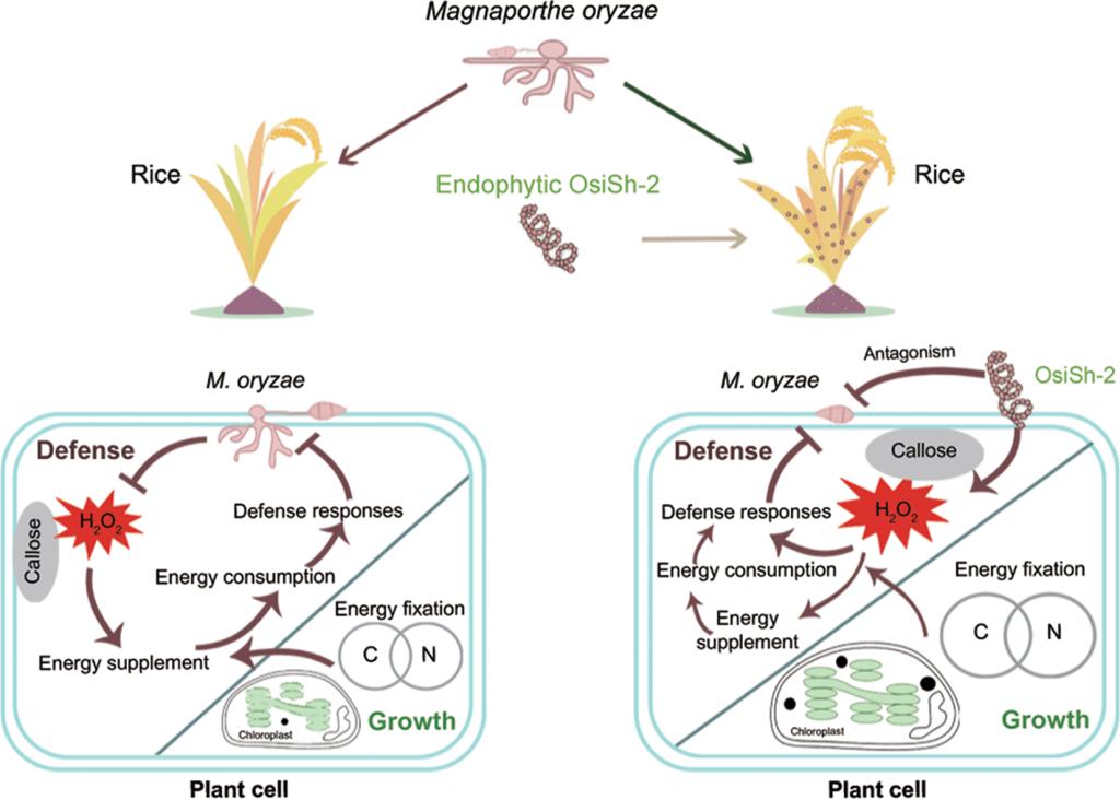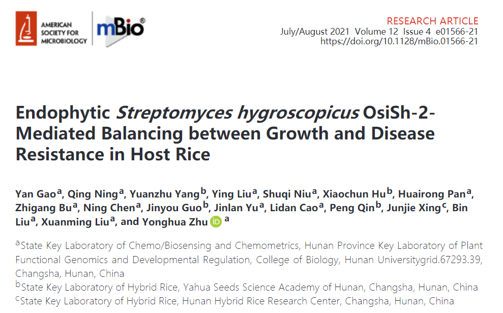 植物-微生物互作科研团队题为“EndophyticStreptomyces hygroscopicusOsiSh-2-Mediated Balancing between Growth and Disease Resistance in Host Rice”的研究论文。该研究揭示了内生放线菌OsiSh-2与水稻形成共生体,诱导宿主水稻进入“防御警备”状态,增强抗病能力的同时参与调控生长与防御相关代谢途径的响应水平,从而维持水稻生长和防御平衡的作用机制。