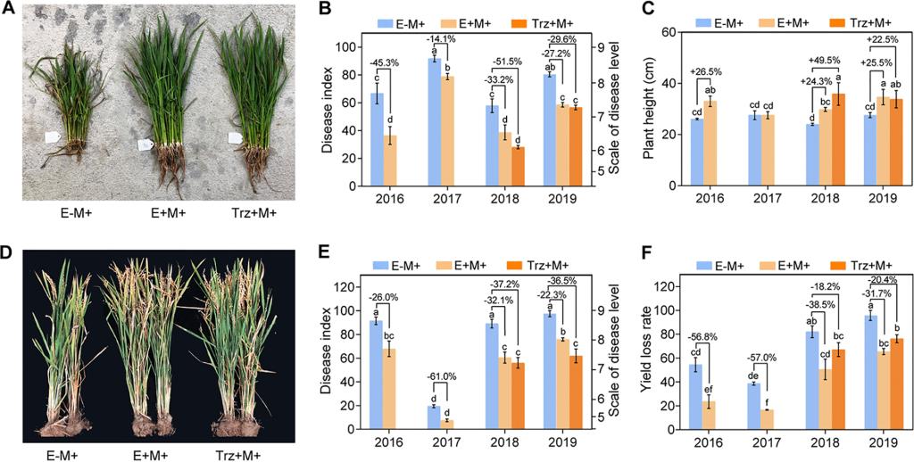 图1.内生放线菌OsiSh-2在田间可增强水稻抗稻瘟病能力并提高产量