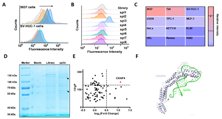 图1. 膀胱癌特异性核酸适体的筛选及靶标鉴定。A,流式细胞术监测筛选进程;B,核酸适体spl3的选取;C,核酸适体的细胞靶向性;D,核酸适体结合蛋白的凝胶电泳;E,核酸适体靶标CKAP4的鉴定;F,核酸适体与CKAP4结合的计算机模拟。
