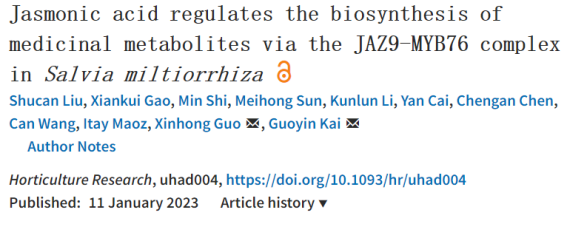 Hortic Res | 开国银/郭新红团队联合解析JAZ9-MYB76复合物介导茉莉酸调控丹参药效物质生物合成的新机制