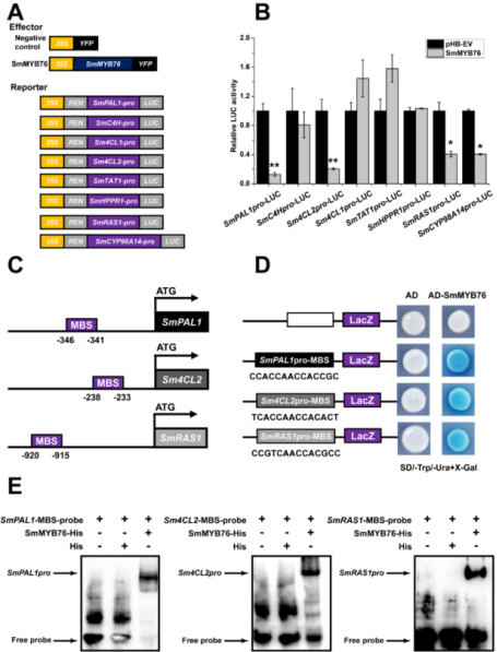 图1 SmMYB76转录抑制SmPAL1,Sm4CL2和SmRAS1