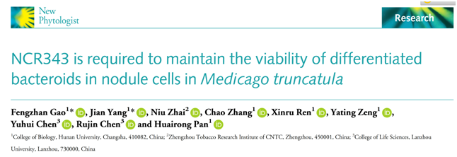 潘怀荣教授课题组在植物学国际知名期刊《New Phytologist》上发表论文,报道了蒺藜苜蓿NCR343在调控终极分化后共生体存活方面的重要功能。