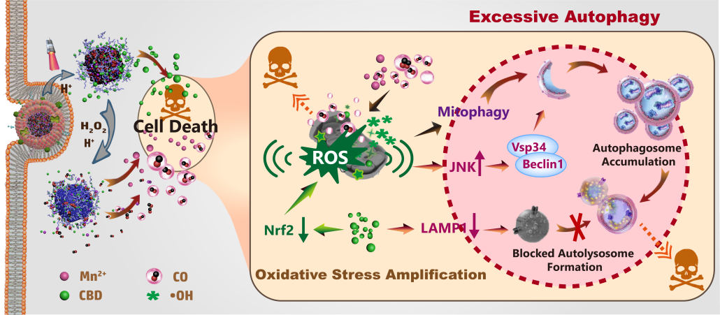 1)发现大麻来源的活性小分子CBD调控TNBC细胞的自噬进程。基于CBD和CO供体构建了仿生CBD协同CO纳米制剂,利用CBD对Nrf2的调控放大CO对线粒体的氧化应激刺激。其次,纳米制剂通过调控ROS/JNK/Beclin1通路和下调LAMP1增强自噬小体的积累和破坏自噬溶酶体的形成,最终导致细胞过度自噬而改善TNBC治疗。相关工作于2023年5月发表于Acta Pharmaceutica Sinica B杂志,论文第一作者为博士生肖畅,通讯作者为91成人网