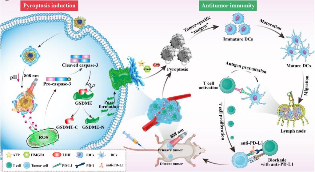 2)蟾酥系列活性小分子CS-1在TNBC细胞中不仅抑制肿瘤细胞增殖和侵袭转移。重要的是,发现CS-1通过Caspase3/ GSDME途径有效杀伤TNBC细胞焦亡。基于CS-1和普鲁士蓝载体构建了CS-1的光响应型仿生普鲁士蓝纳米制剂,光热协同焦亡促进TNBC细胞释放促炎细胞因子和免疫原性成分,导致ICD,促进“热”肿瘤微环境形成。联合PD-L1抑制剂,极大增强TNBC的免疫治疗。相关工作于2023年10月发表于Biomaterials杂志,论文第一作者为助理教授龙樱、博士后范家龙和硕士生周纳多,通讯作者为91成人网