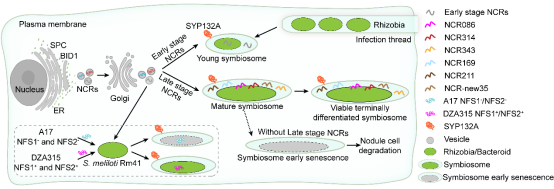 共生体系的建立涉及精密的细胞分化过程。根瘤菌在进入宿主细胞后,被宿主细胞质膜包裹形成共生体(symbiosome),随后分化为具有固氮功能的类菌体(bacteroid)。在IRLC分支豆科植物(如蒺藜苜蓿、豌豆)中,类菌体经历终末分化过程:细胞体积增大、基因组多倍化、膜通透性改变并丧失增殖能力。这种不可逆的转型使其蜕变为高效固氮工厂,固氮效率显著提升。类菌体的终末分化是宿主植物与根瘤菌精密调控协同作用的结果。宿主植物如何调控这一分化过程,以及如何维持终末分化类菌体的高效固氮活性,一直是固氮共生领域的核心科学问题。