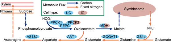 作者们还关注了根瘤碳氮代谢网络的其它关键节点基因。研究发现,根瘤谷氨酰胺合成酶1a(GS1a)同样专一表达于非侵染细胞的细胞质中,参与生成谷氨酰胺。敲除GS1a也展现出和debino4类似的根瘤细胞早衰表型。此外,作者们还发现:谷氨酸合成酶GOGAT1、天冬氨酸氨基转移酶AAT1、天冬酰胺合成酶AS1/2均是在非侵染细胞特异表达。这些蛋白组成了非侵染细胞内完整的氮同化网络——GS1a-GOGAT1循环产生谷氨酸,AAT1利用OAA和谷氨酸生成天冬氨酸,最终由AS1/2把天冬氨酸转化为天冬酰胺(苜蓿根瘤主要的氮输出形式)。